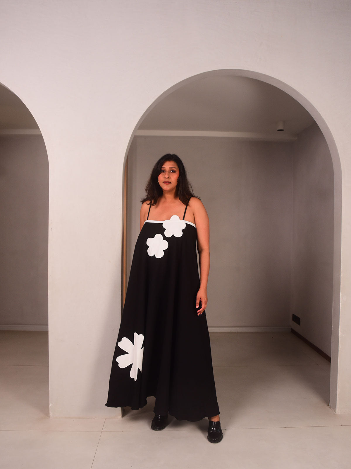 Blank effortless elegance in a timeless, wearable design. Our sleek black strappy dress crafted from cotton linen adorned with delicate white flower appliqué patches for a romantic and feminine touch. Pair with dainty heels or sandals to maintain the elegance of the dress.blank