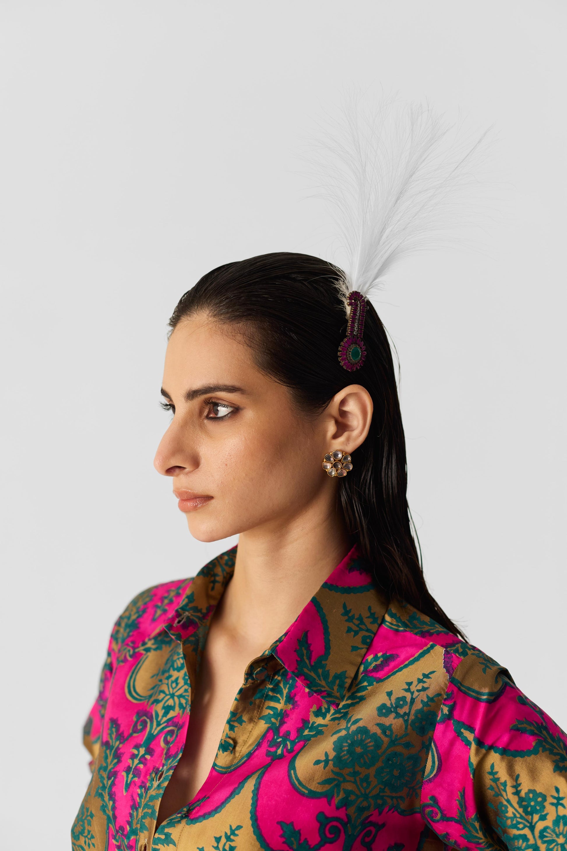 The Zuzi Print Shirt is a vibrant celebration of traditional craftsmanship, featuring a carefully handblock-printed design. Showcasing bold hot pink and classic green floral patterns, this shirt exudes lively elegance. It is tailored with a front button closure, a classic collar, and cuffed sleeves with matching buttons for a refined finish. The skirt features a modern front twisted knot, adding a contemporary touch, and is secured with a center-back zipper and hook-and-eye closure for a seamless fit. Paired with a matching V-neck blouse in the same print, the blouse is designed with a front hook-and-eye closure for a tailored and flattering fit. Perfect for those who appreciate a fusion of tradition and contemporary style, this shirt brings timeless artistry to your modern wardrobe.